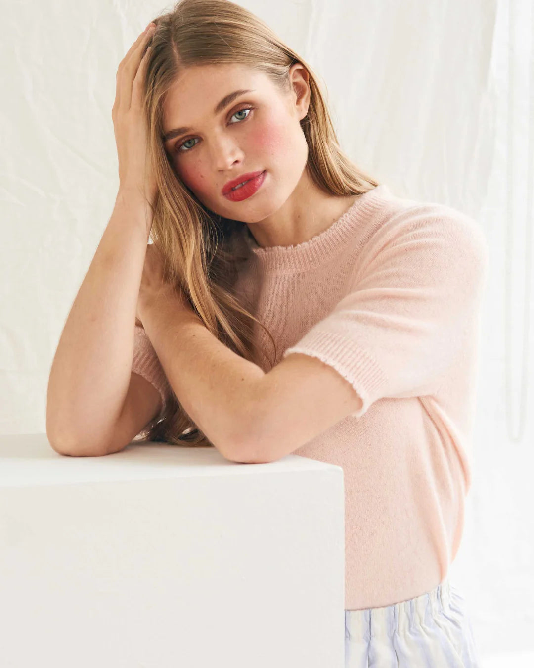 Jumper 1234 cashmere jumper. Pale pink short sleeve cashmere jumper with 'distressed' ribs. A great new addition to our distressed styles, slightly generous fit. Part of the core collection from Jumper 1234, those jumpers and cardigans in plain and stripe that you also need, but can't always find!