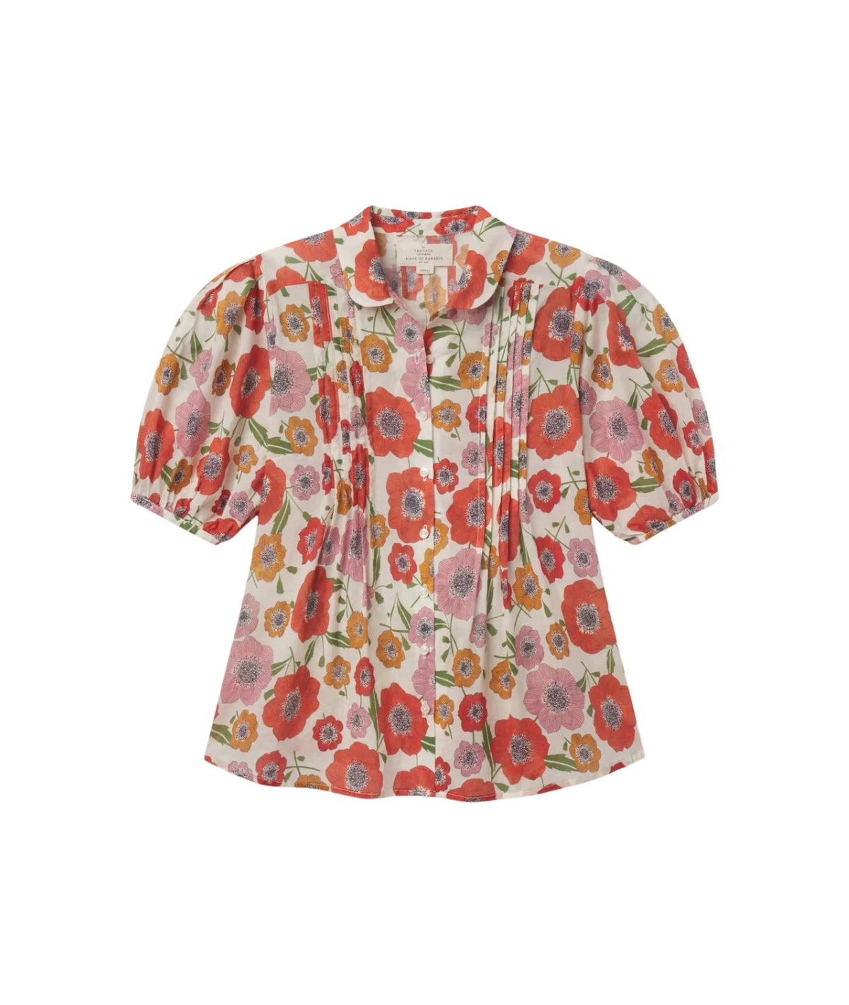 The Nadine Blouse is a short-puff sleeved blouse with a flattering curved hemline and petite pintucks that lend texture and hand crafted charm. Slightly cropped length keeps this blouse airy and whimsical. Shown here in Poppy Costa and made from our cotton voile.