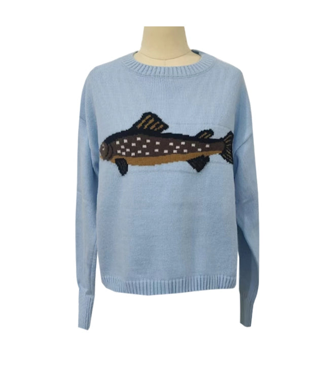Light Blue sweater featuring a Fisherman Sardine.