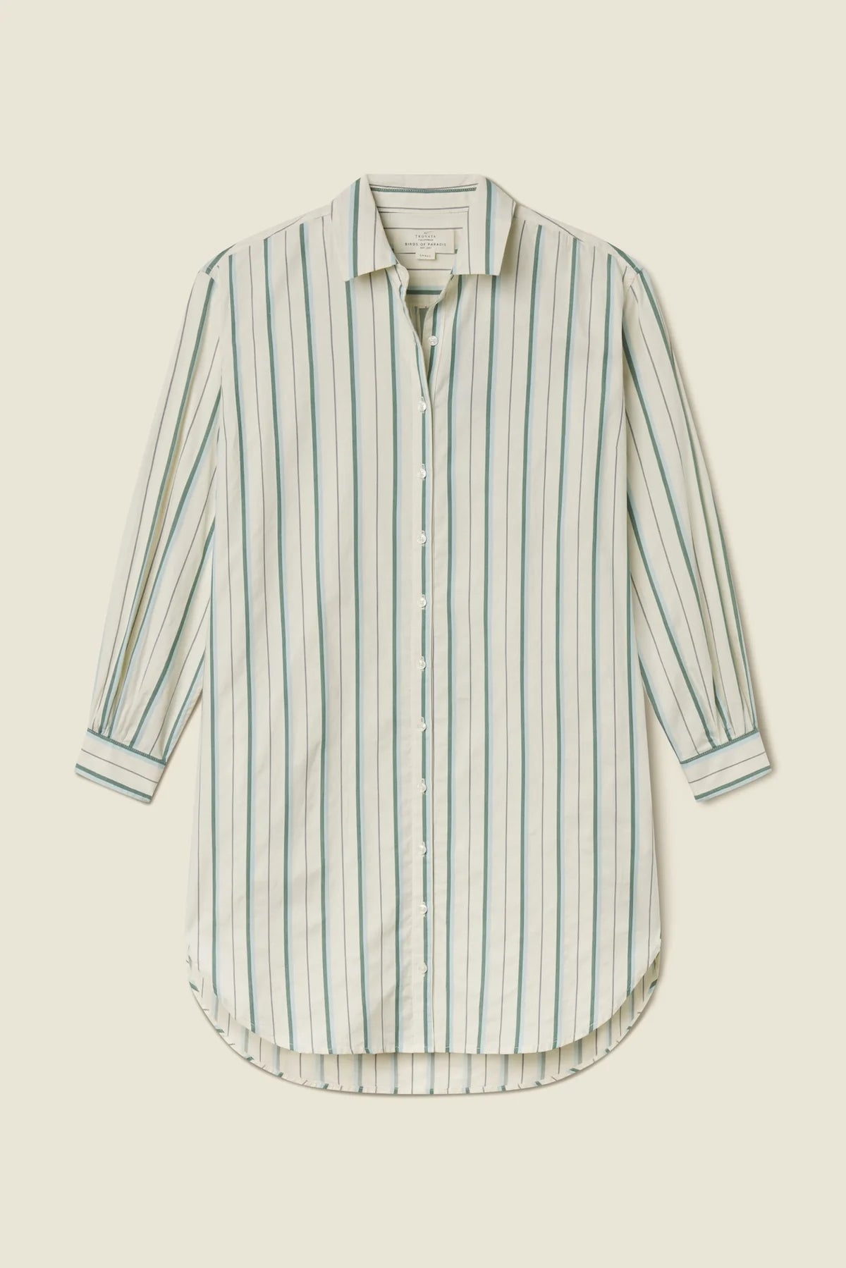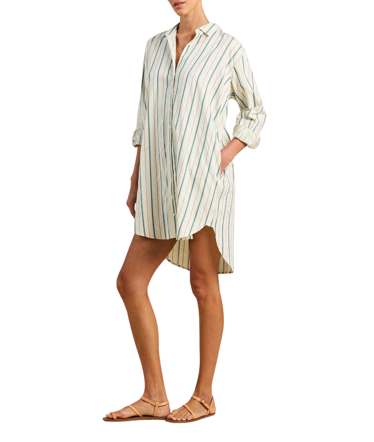 The Callie Shirtdress is a short shirtdress with a covered front button placket, folded collar and full length sleeves with gathered cuffs. Featuring our signature fabric tab gathers at the back waist for added shape, and hidden side seam pockets. Shown here in Verde Stripes and made from our cotton beach oxford.