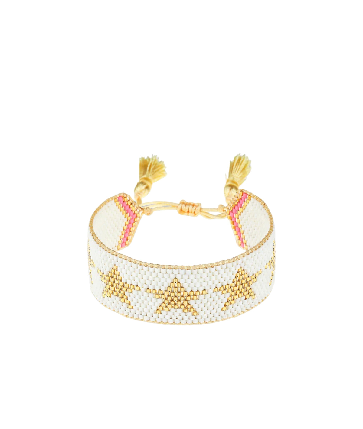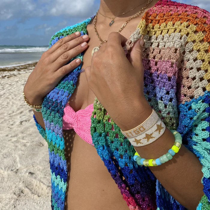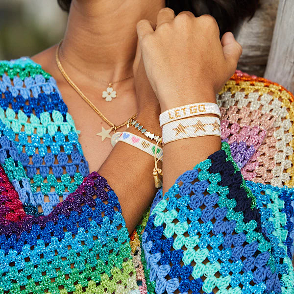 Hart’s beaded bracelets are delicate due to their handmade construction and delicate materials like fragile glass beads and handcrafted tassels. Please treat your bracelet with extra TLC. Avoid banging your wrist against surfaces, washing dishes and swimming in your bracelet, and throwing the bracelet in your handbag.